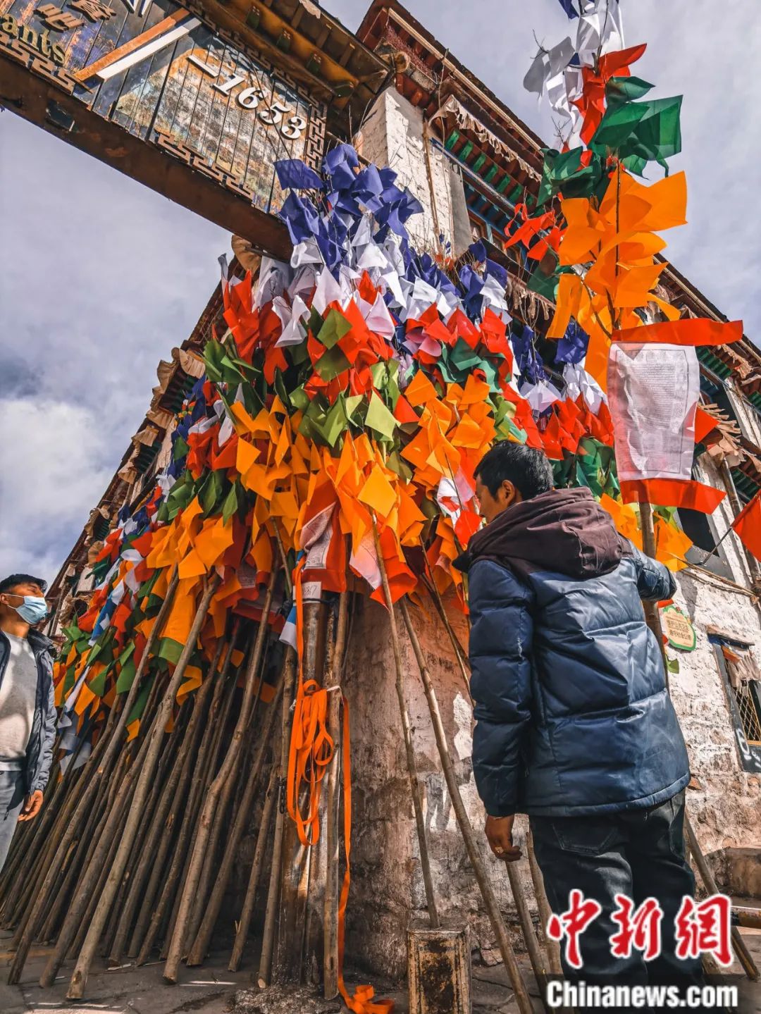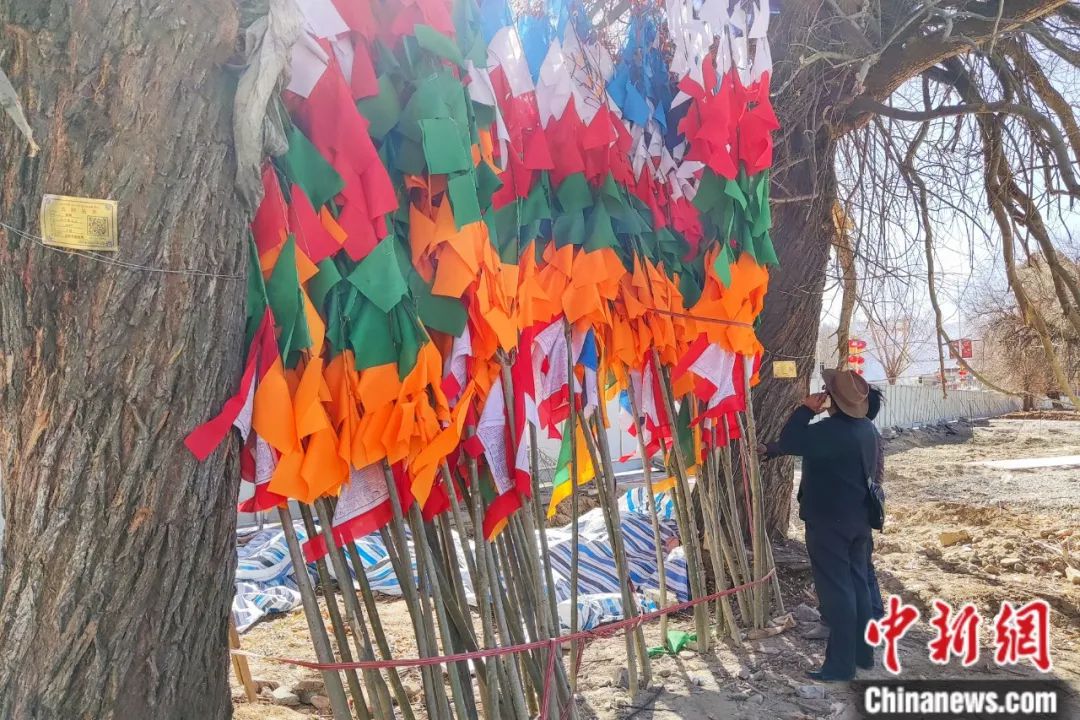 根據(jù)傳統(tǒng),西藏民眾會(huì)在藏歷新年初三前后將屋頂、山頂、湖邊等地懸掛的五彩經(jīng)幡進(jìn)行更換,祈禱新年吉祥如意、五谷豐登。