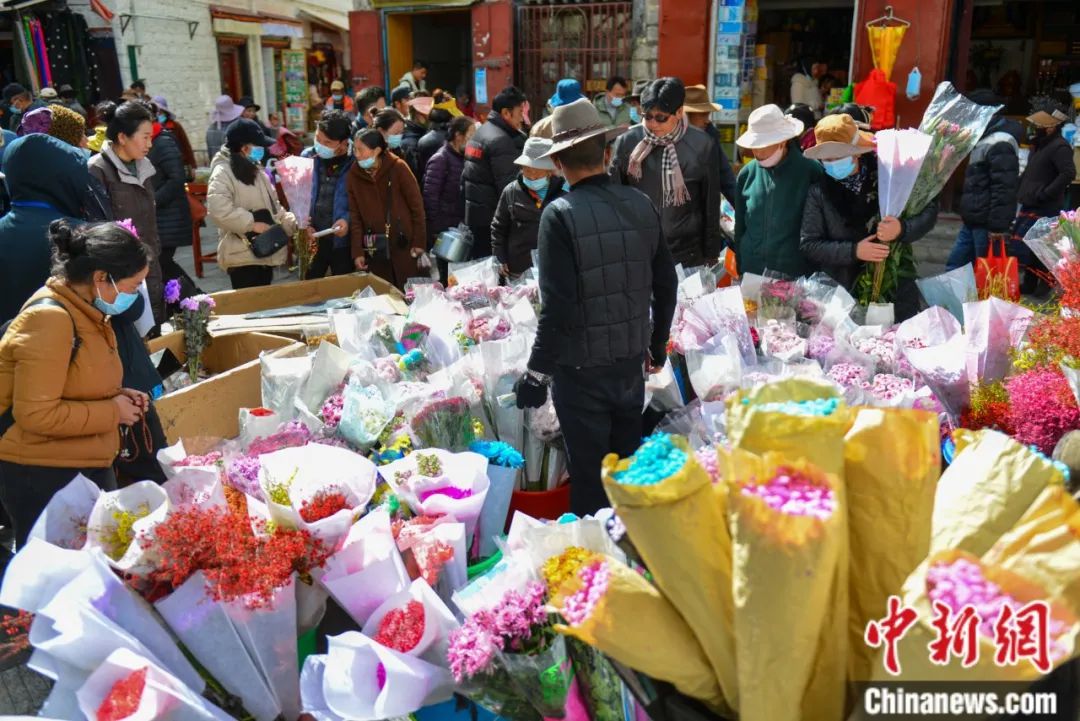 拉薩民眾在年貨市場(chǎng)購(gòu)買(mǎi)鮮花。江飛波 攝