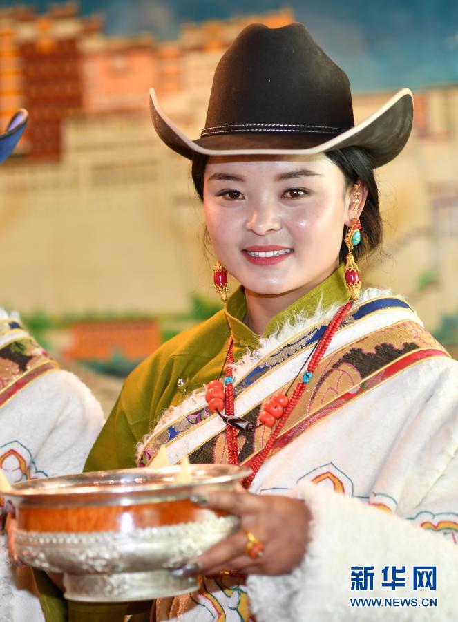 2月12日,在藏北當(dāng)雄縣沖噶村,一名牧民盛裝敬酒。新華社記者 覺果 攝