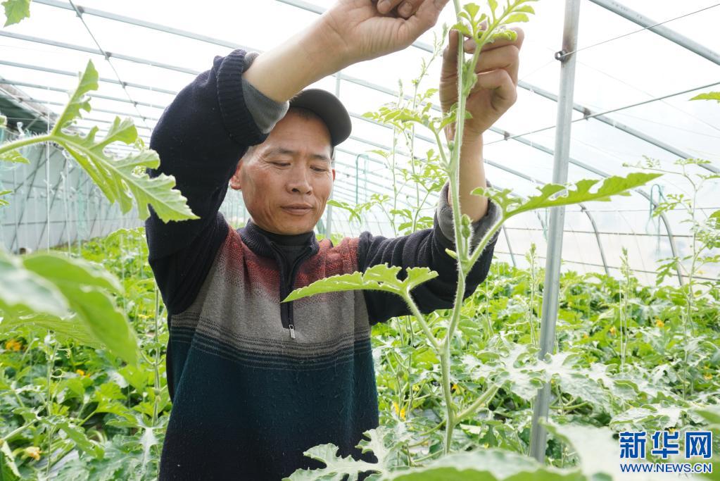 西藏曲水縣南木鄉(xiāng)江村村民李守遠(yuǎn)正在給蔬菜授粉(2021年3月30日攝)。 新華社記者 王澤昊 攝