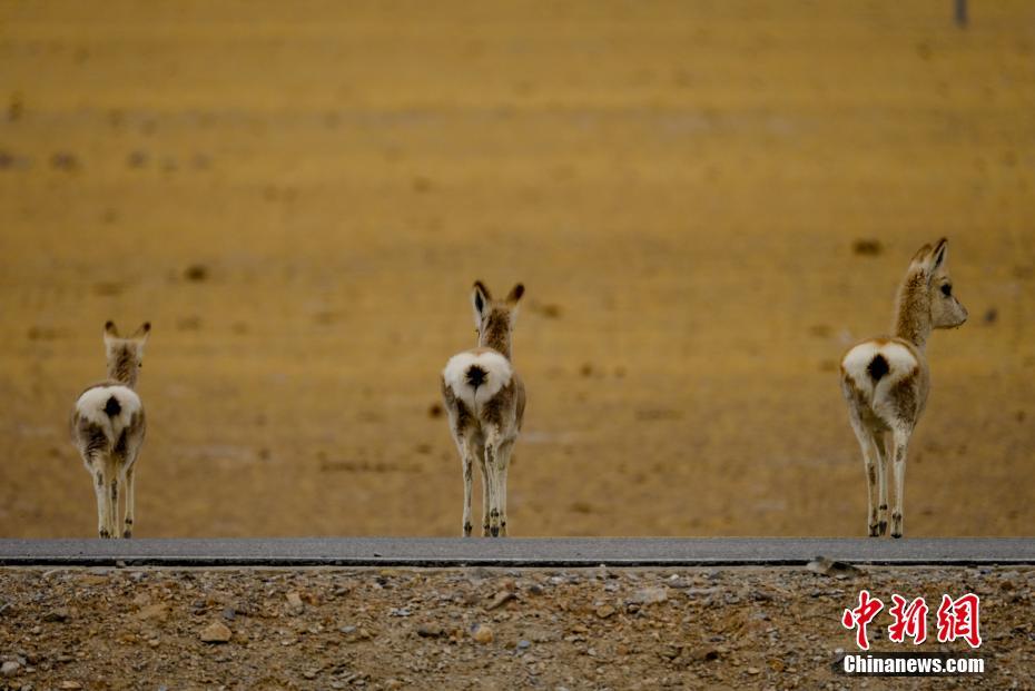 5月2日,三頭藏原羚在西藏那曲雙湖縣穿越公路。當(dāng)?shù)啬撩穹Q藏原羚為黃羊,是青藏高原特有物種。