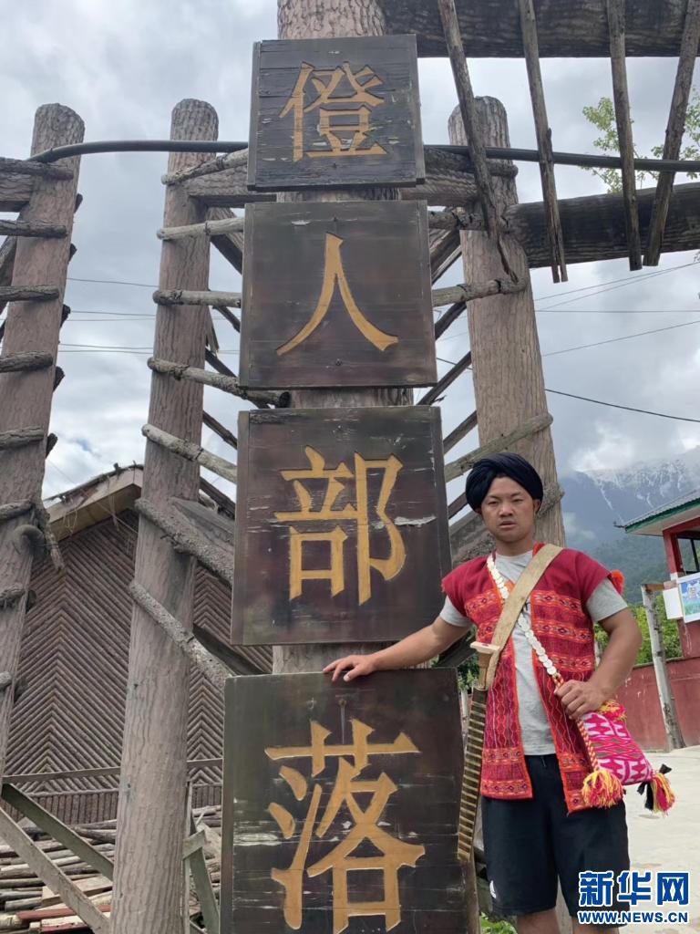 迪龍身著僜人傳統服飾站在村莊門口。 新華社發(fā)