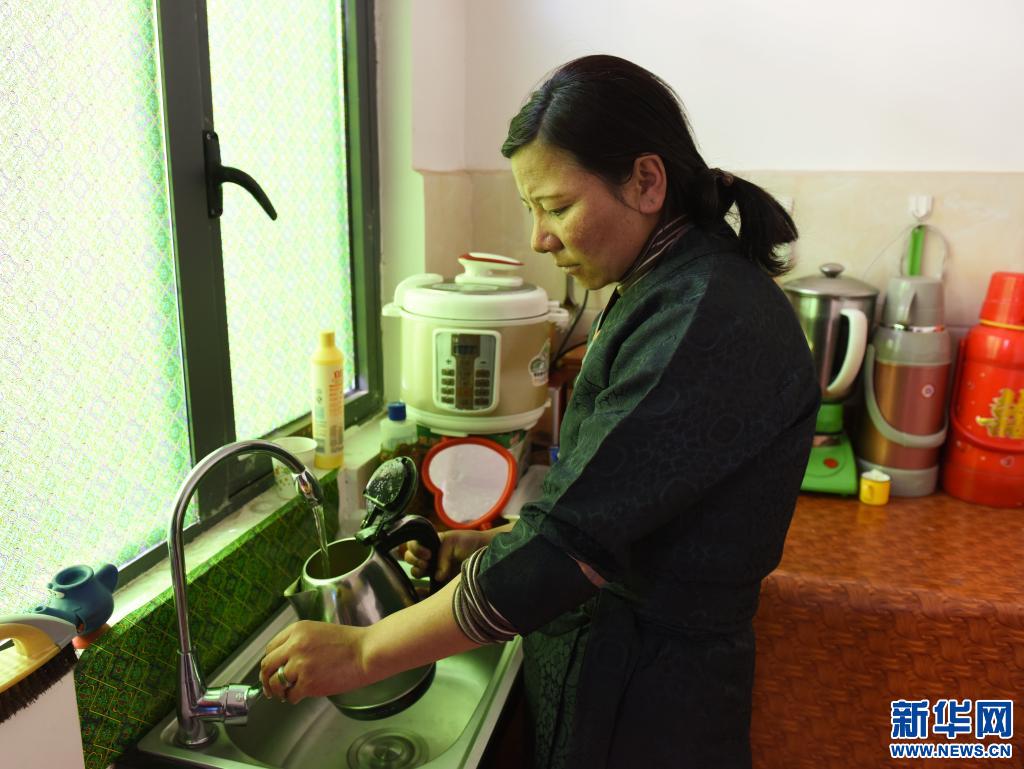 森布日極高海拔生態(tài)搬遷安置點內,村民次仁卓嘎終于在家里用上了自來水(2020年1月12日攝)。新華社記者 田金文 攝