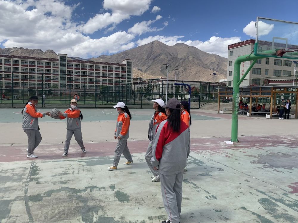 6月1日,西藏自治區(qū)拉薩市,拉薩那曲第二高級(jí)中學(xué)女學(xué)生們?cè)诓賵龃蚧@球。新華社記者齊菲攝