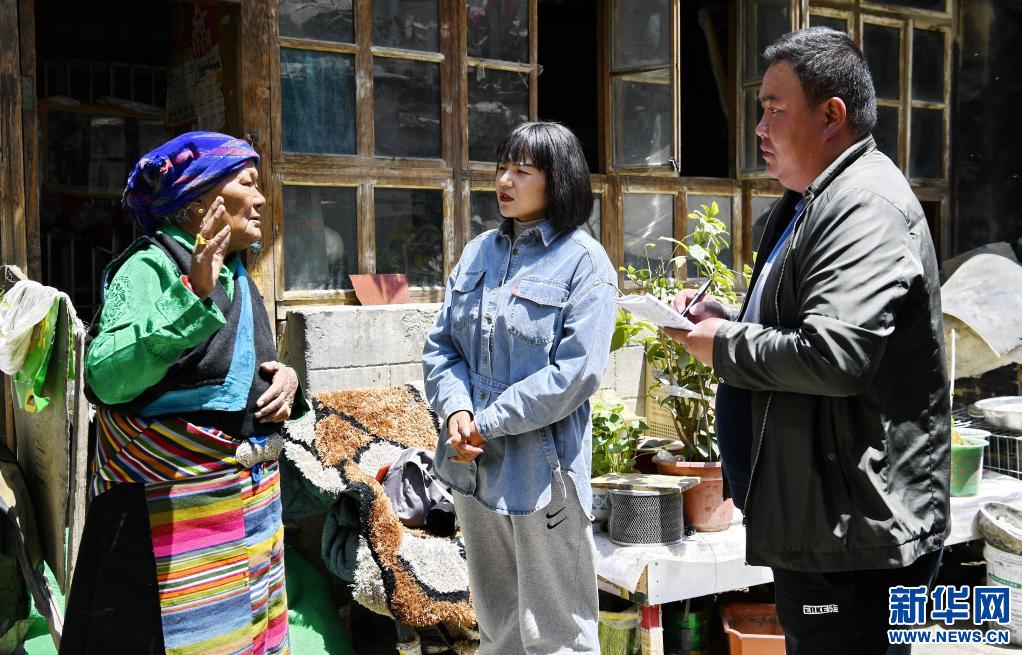 央窮和來(lái)家里走訪(fǎng)的工作人員交流(4月30日攝)。新華社記者 張汝鋒 攝