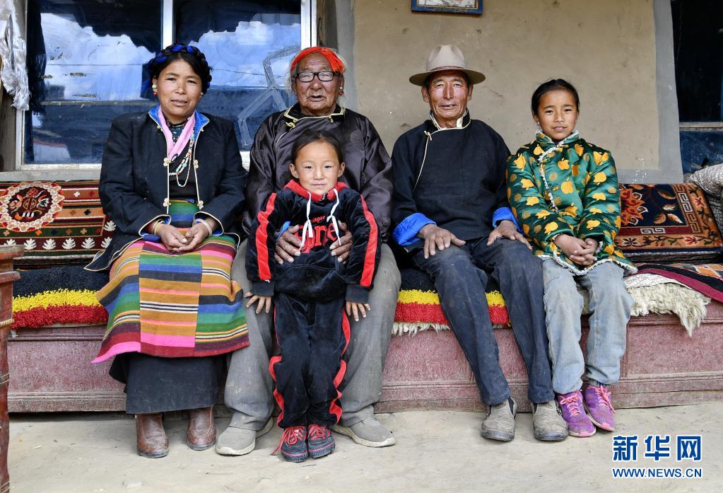 這是索朗老人和兒子扎西(右二)、孫媳婦次仁央宗(左一)及曾孫女在一起合影(4月18日攝)。新華社記者 張汝鋒 攝