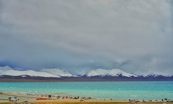從羊八井出發(fā)至當(dāng)雄縣,有一條向左的岔路,沿著這條路一直向前開約60公里,就能到達(dá)西藏最著名的景區(qū)之一——納木措。納木措,湖面海拔4718米,形狀近似長(zhǎng)方形,東西長(zhǎng)70多千米,南北寬30多千米,湖的東南部是直插云宵、終年積雪的念青唐古拉山主峰,清澈的湖水便來自念青唐古拉山融化的冰雪,北側(cè)則倚偎著和緩連綿的高原丘陵,廣闊的草原繞湖四周,似是將納木措小心翼翼地護(hù)在懷中。湖水顏色由罕見的碧藍(lán)與碧綠色相結(jié)合,是畫師都不易調(diào)出的顏色,遠(yuǎn)遠(yuǎn)望去,碧波粼粼的湖水與周圍的山脈、草原、藍(lán)天、白云交相輝映,令在場(chǎng)的人不禁連連感嘆仿佛置身于仙境之中。