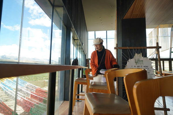 從正門進(jìn)入,穿過牦牛文化空間走廊,便可到能夠以最佳視角欣賞念青唐古拉山的VR觀景臺(tái)。緊鄰觀景臺(tái)右側(cè),是一間擺放當(dāng)?shù)匚膭?chuàng)產(chǎn)品、各類書籍的觀景咖啡廳。該咖啡廳的兩面墻體設(shè)計(jì)為超大落地窗,在此休息的游客可以邊品嘗咖啡,邊欣賞念青唐古拉山及拉多草原的美景。走進(jìn)咖啡廳,記者看到不少在這里休息的游客都在低頭寫著什么,經(jīng)咖啡廳負(fù)責(zé)人介紹:“這些游客是在寫明信片,我們這里不僅提供餐飲,還提供印有本地風(fēng)景的明信片,并同中國(guó)郵政合作,幫助游客按時(shí)將明信片寄到他們的親朋好友手中,讓游客們的旅途變得更有意義?!?/p>