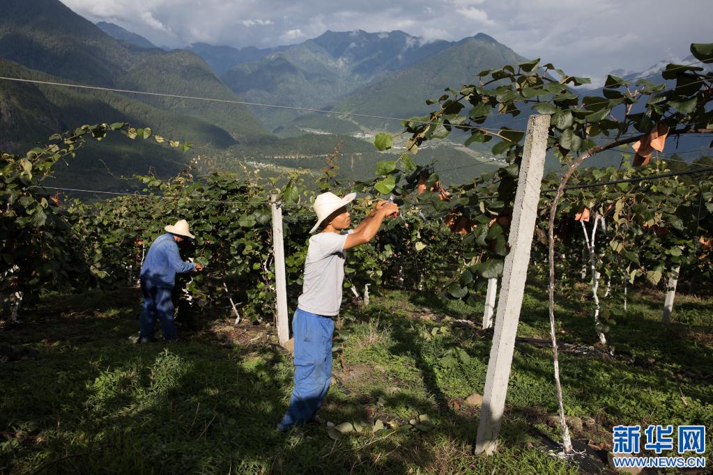 在西藏自治區(qū)林芝市察隅縣下察隅鎮(zhèn)京都村,獼猴桃園工作人員在修剪獼猴桃枝葉(7月22日攝)。京都村通過“公司+農(nóng)戶”模式引進了獼猴桃種植,幫助村民增收。新華社記者 金立旺 攝