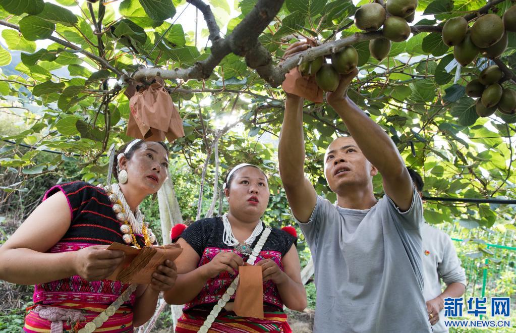 在西藏自治區(qū)林芝市察隅縣下察隅鎮(zhèn)京都村,獼猴桃園管理員高峰(右)在指導當?shù)卮迕窠o獼猴桃果實套紙袋(7月22日攝)。京都村通過“公司+農(nóng)戶”模式引進了獼猴桃種植,幫助村民增收。新華社記者 金立旺 攝
