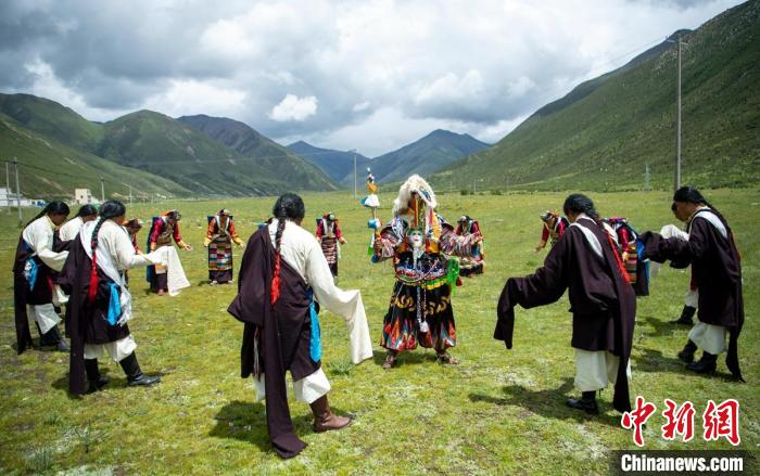 盛夏的西藏自治區(qū)拉薩市墨竹工卡縣門巴鄉(xiāng)仁多崗村草地上,28歲的尼瑪與身著盛裝的藏族牧民們跳著國家級(jí)非物質(zhì)文化遺產(chǎn)直孔普堆巴宣舞,迎接遠(yuǎn)道而來的游客,動(dòng)作優(yōu)美的歌舞吸引了大家駐足觀賞,并用手機(jī)或相機(jī)記錄。