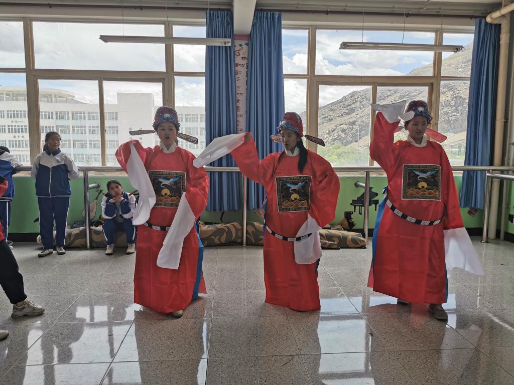幾天相處下來,她看到藏族孩子能歌善舞的天性,便主動(dòng)把家鄉(xiāng)的黃梅戲表演給學(xué)生。隨著學(xué)生對黃梅戲愈發(fā)好奇,金慧琳組建了全區(qū)首個(gè)藏漢雙語黃梅戲?qū)W生社團(tuán),并以黃梅戲代表性曲目《女駙馬》為藍(lán)本,以藏式歌舞為表現(xiàn)形式,進(jìn)行創(chuàng)造性轉(zhuǎn)化和創(chuàng)新性發(fā)展。