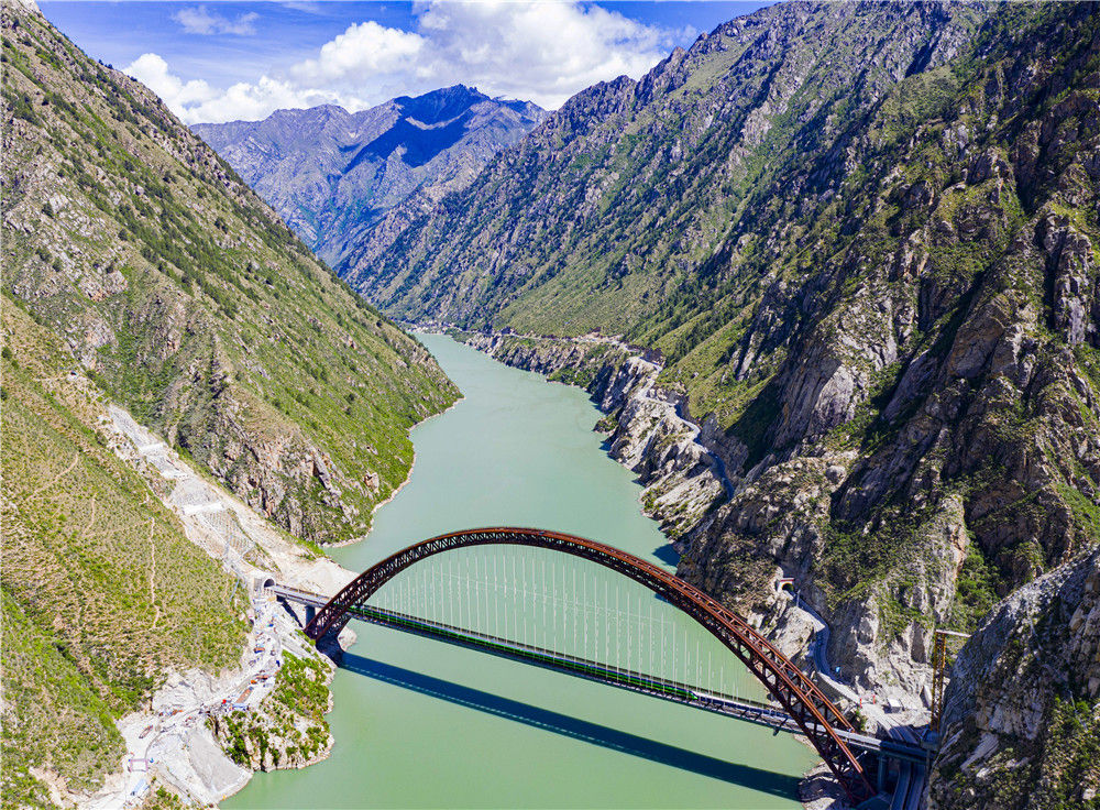 6月17日,試運(yùn)行的復(fù)興號(hào)列車行駛在川藏鐵路拉林段藏木特大橋(無(wú)人機(jī)照片)。新華社記者 普布扎西 攝