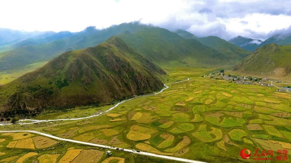 無人機鳥瞰青稞田地。人民網(wǎng) 次仁羅布攝