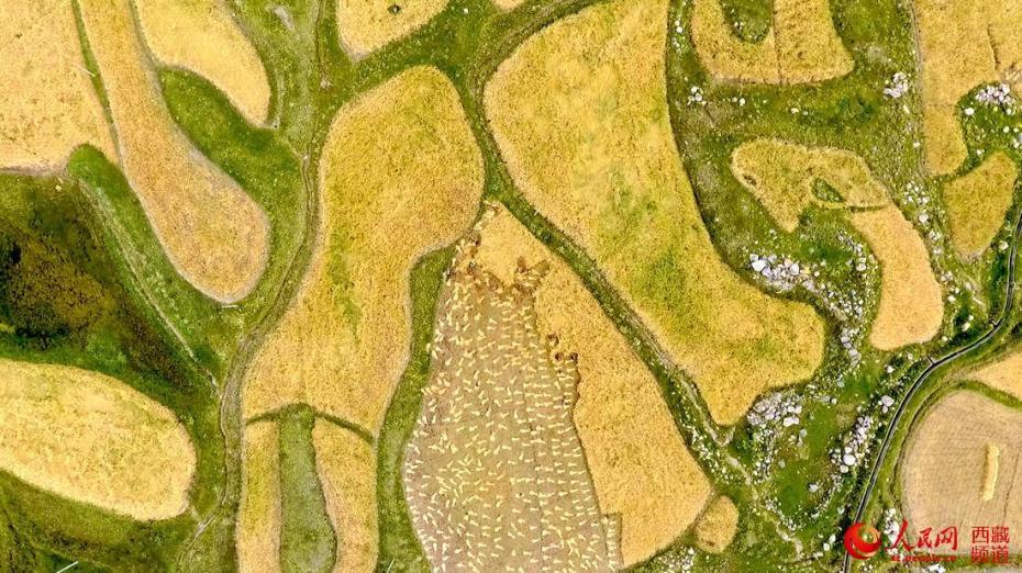 九月的西藏,已進入青稞成熟收割時節(jié)。記者來到拉薩市曲水縣熱堆村,成片成片成熟了的青稞,金黃耀眼。村民們抓緊天氣晴好的時機,互幫互助忙收割,確保顆粒歸倉。地頭田間,有的已被割倒束成捆,也有的仍在迎風搖曳,等待收割,村民們揮舞著鐮刀,將成熟的青稞收割、扎捆、然后堆砌成一排排整齊的青稞垛子,用拖拉機將青稞運回家,再上架晾曬,看著沉甸甸的麥穗,聞著空氣中彌漫著沁人心脾的青稞香,村民們臉上露出了喜悅的微笑。無人機鳥瞰青稞田地。人民網(wǎng) 次仁羅布攝