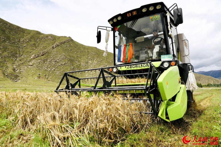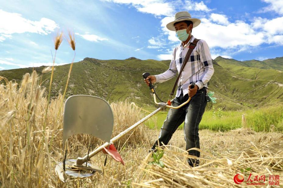 村民手持機械收割青稞。人民網(wǎng) 次仁羅布攝