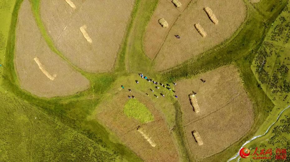 無人機鳥瞰田間整理捆扎好的青稞。人民網(wǎng) 次仁羅布攝