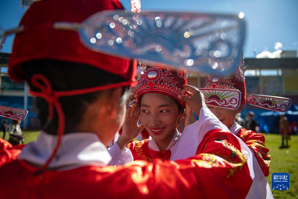 9月13日,參加2021雅礱文化旅游節(jié)開幕式文藝演出的山南市第二高級中學(xué)學(xué)生登臺前整理服裝。新華社記者 孫瑞博 攝