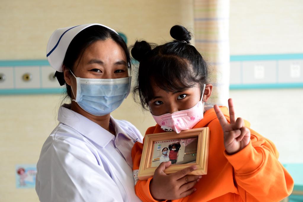11月2日,4名已康復(fù)的先心病患兒在出院前和醫(yī)護(hù)人員等合影。黃博涵 攝