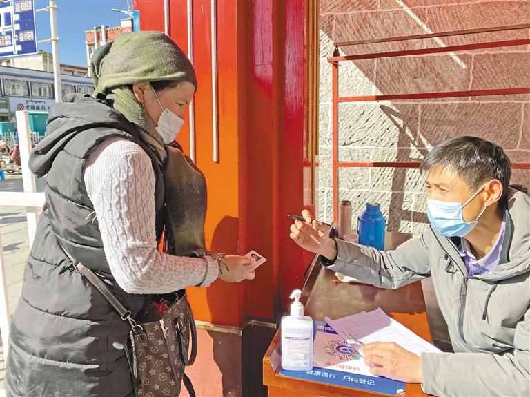 八廓商城市場部部長卓嘎介紹說:“為廣大市民提供一個安全、祥和的購物環(huán)境,我們在商場設(shè)有5個進出口,每個進出口都需掃行程碼、測量體溫后才可進入。因為有些老人沒有智能手機,無法掃健康瑪,我們會登記姓名、身份證號、聯(lián)系方式。并且在增加的攤位旁增設(shè)消防器材,不定時巡邏。”