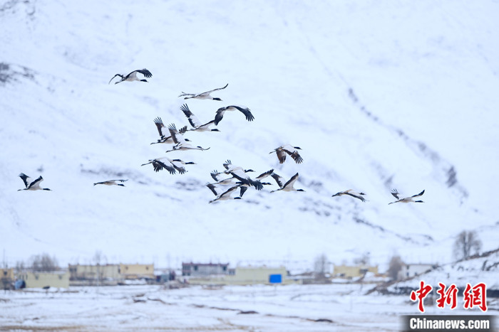 圖為2月23日,西藏林周縣虎頭山水庫附近村莊上空,一群黑頸鶴飛過,遠處白雪皚皚。中新社記者 江飛波 攝