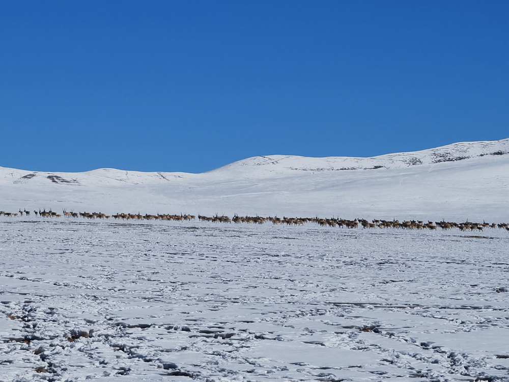 這讓仁增羅布的心揪了起來。之后幾天,他又跑了一次,就為了確認(rèn)這些藏羚羊的生存情況。零下三四十度的天氣不變,草場厚厚的積雪沒有消退的意思,藏羚羊們的生存受到極端自然天氣的巨大威脅。