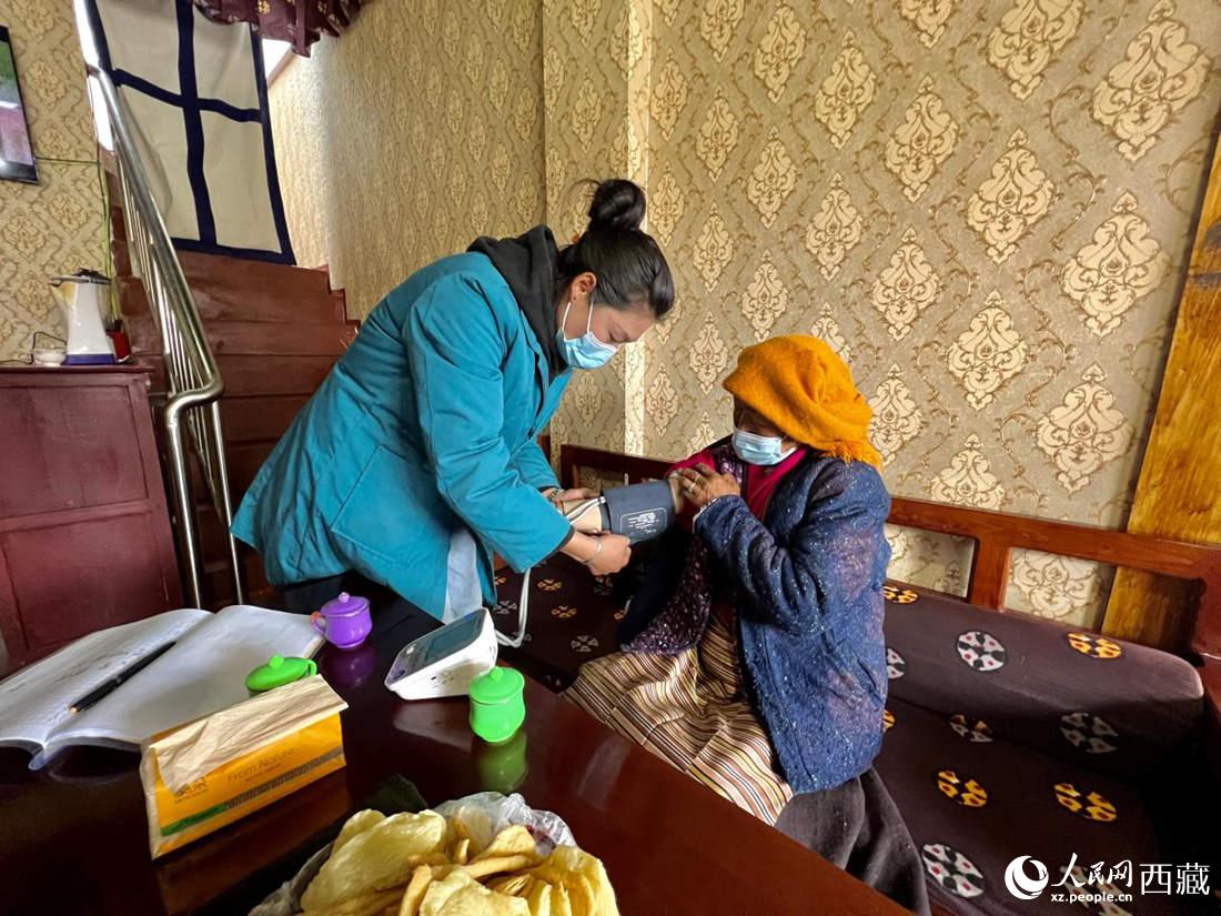 醫(yī)護人員為老人定期測量血壓。人民網(wǎng) 次仁羅布攝