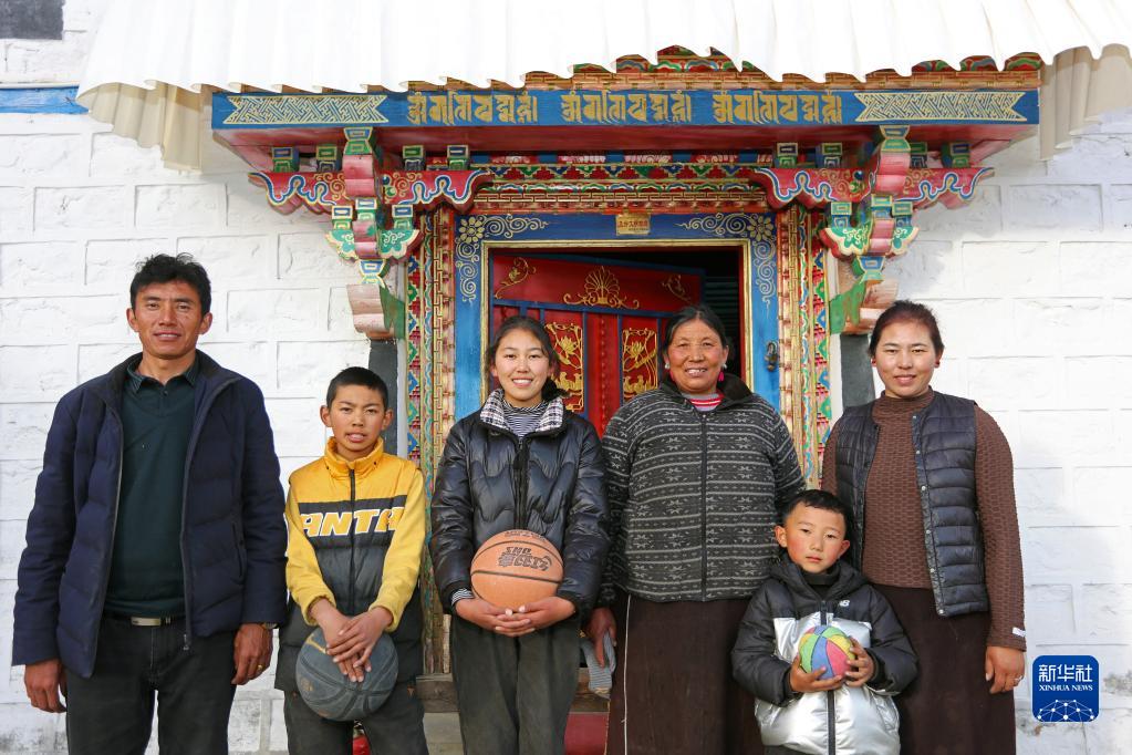西藏自治區(qū)林芝市嘎拉村村民達瓦堅參(左一)一家在家門口合影(2022年2月23日攝)。新華社記者姜帆 攝