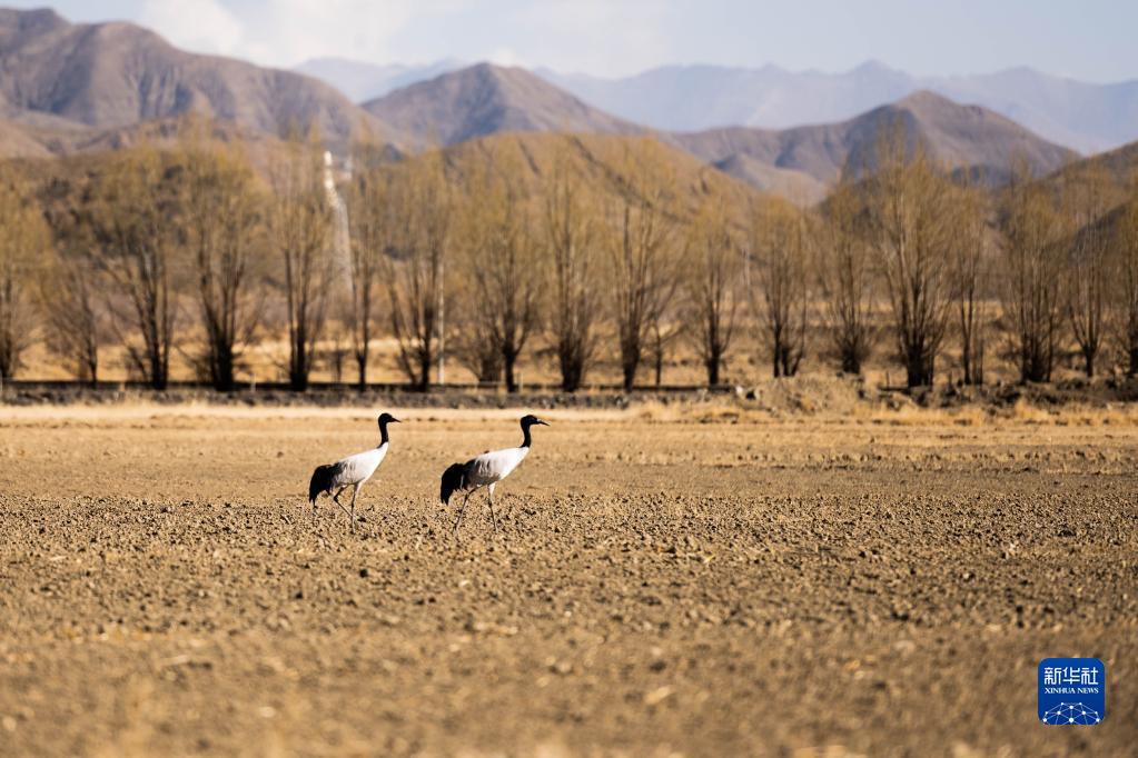 這是在西藏日喀則市桑珠孜區(qū)的農(nóng)田里拍攝的黑頸鶴(3月12日攝)。新華社記者 周荻瀟 攝