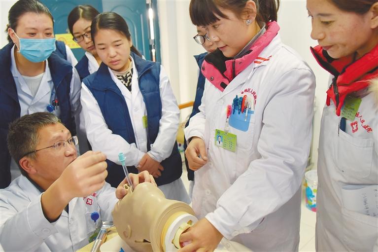 圖為西藏自治區(qū)那曲市人民醫(yī)院援藏專家手把手向醫(yī)務(wù)人員傳授“氣管插管術(shù)”動(dòng)作要領(lǐng)。記者 次仁片多 攝
