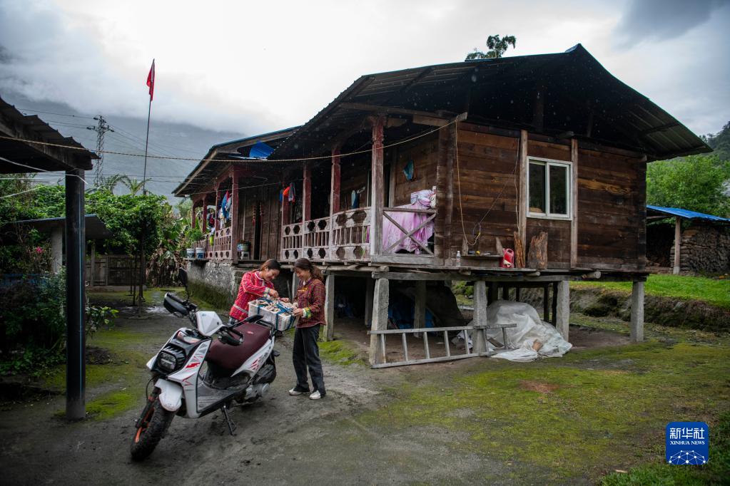 明珠措姆準(zhǔn)備騎摩托車前往市場,銷售剛采摘的平菇(4月14日攝)。