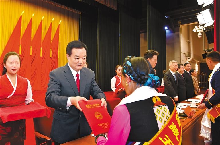 4月29日上午,西藏自治區(qū)慶祝“五一”國(guó)際勞動(dòng)節(jié)暨表彰大會(huì)在拉薩舉行。自治區(qū)黨委書記王君正出席會(huì)議并講話。這是王君正為受表彰代表頒獎(jiǎng)。記者 旦增西旦 攝