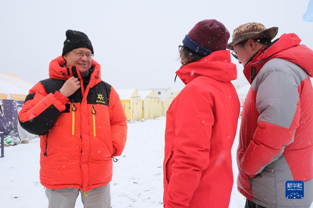 朱彤院士(右一)率領(lǐng)隊(duì)伍在絨布冰川附近進(jìn)行拉練。(2022年5月1日攝)新華社記者姜帆 攝