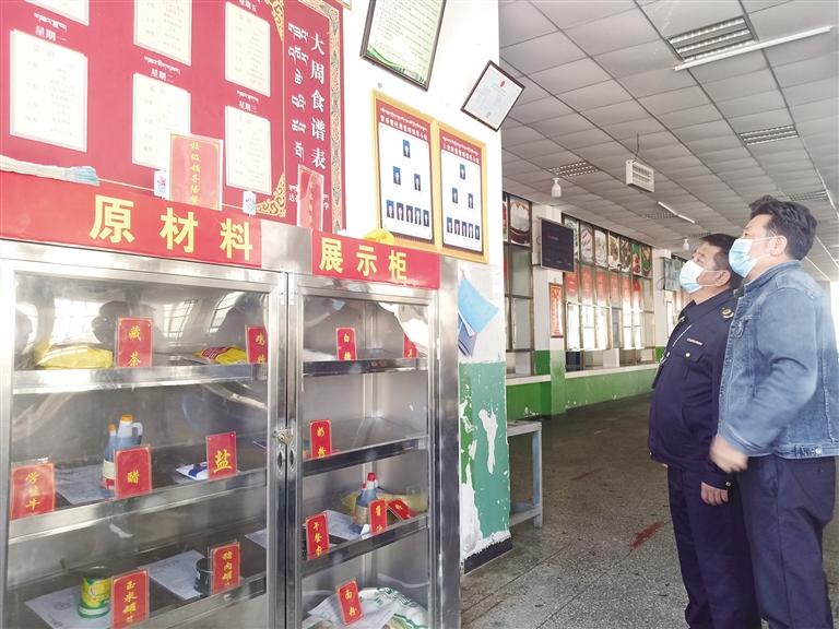 拉薩市市場(chǎng)監(jiān)管局執(zhí)法人員檢查學(xué)?!盎ヂ?lián)網(wǎng)+明廚亮灶”工程。