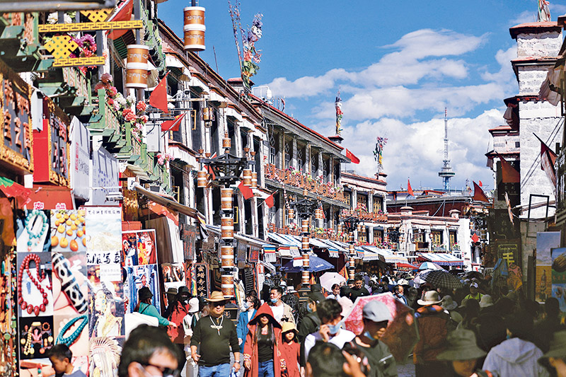“各民族建起來(lái)的八廓街”。環(huán)繞大昭寺的八廓街,距今已有1300多年歷史。從形成之日起,這里就深深鐫刻下各民族共同開(kāi)發(fā)西藏的印跡。