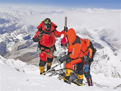 科考隊(duì)員在珠峰海拔8800米以上架設(shè)自動(dòng)氣象站。新華社特約記者 索朗多吉攝
