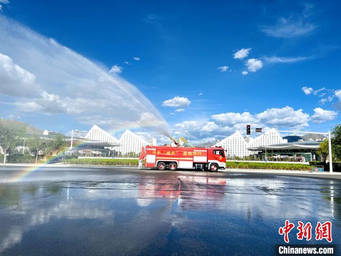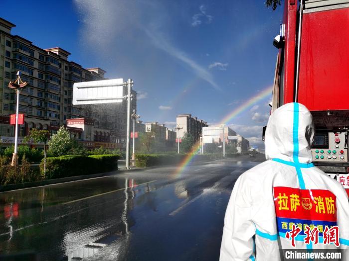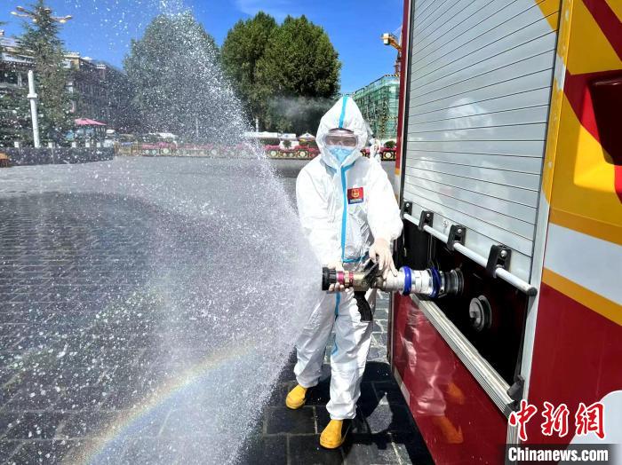 圖為拉薩消防指戰(zhàn)員在主城區(qū)街道進(jìn)行消殺?!±_市消防救援支隊(duì) 攝
