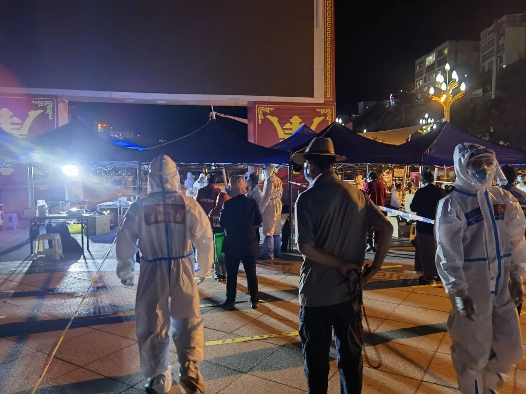 “為了您的安全,請保持1米以上間隔,謝謝?!蓖砩?點多,在茶馬廣場,支隊三級消防士張興梁,依然堅守在抗疫一線,維持著排隊做核酸的長隊。從早上7點開始,張興梁和其他消防隊員已堅守了14個多小時?!拔鞑貢円箿夭钐卮?,白天防護(hù)服里面衣服都濕透了,但是到晚上這個點已經(jīng)干了,正好不用換衣服了?!睆埮d梁打趣的說到。