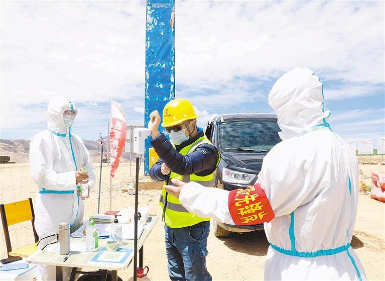 在西藏阿里普蘭機(jī)場(chǎng)項(xiàng)目施工現(xiàn)場(chǎng),施工人員經(jīng)過體溫檢測(cè)、身份登記、消毒等程序后,才能進(jìn)入工地。施工現(xiàn)場(chǎng)機(jī)器轟鳴,管理人員分兵把口,施工人員各司其職,整個(gè)工地處處都是忙碌的身影。