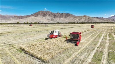 西藏日喀則市江孜縣熱索鄉(xiāng)努康村農(nóng)機(jī)合作社的村民集中對(duì)村里三千多畝耕地進(jìn)行機(jī)械化收割新華社記者 晉美多吉攝