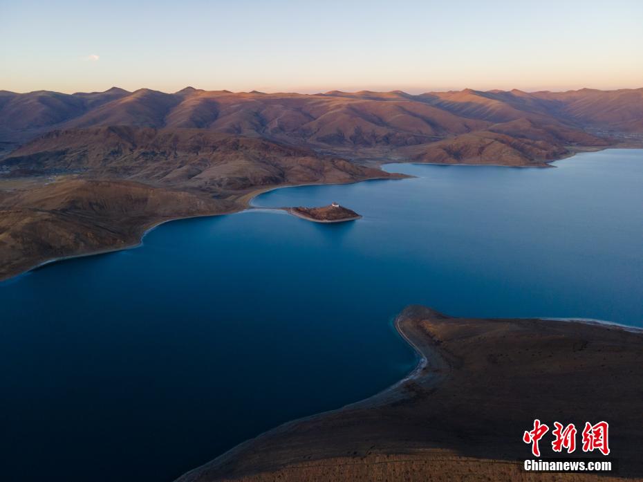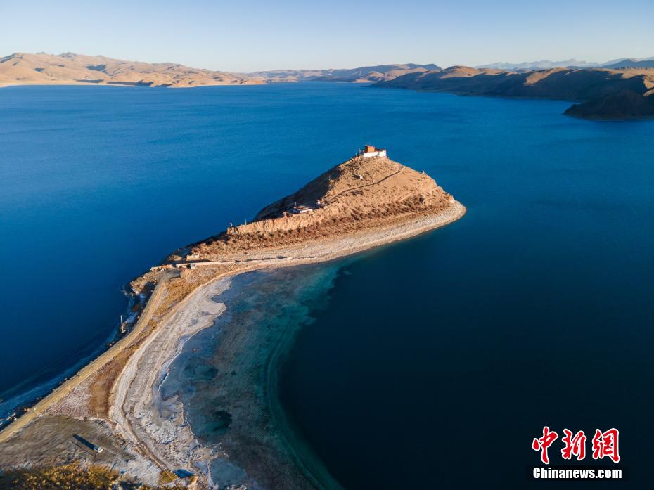 近日,西藏自治區(qū)山南市羊卓雍錯(cuò)(簡稱羊湖),冬日由于沒有云層遮擋,湖水更顯深藍(lán)、孔雀藍(lán)。航拍視角下,湖水像巨大的寶石鑲嵌于高原大地,風(fēng)光壯麗。羊卓雍錯(cuò)藏語意為“碧玉湖”,湖面海拔4441米,與納木錯(cuò)、瑪旁雍錯(cuò)并稱西藏三大“圣湖”。圖為羊湖著名景點(diǎn)日托寺。 江飛波 攝