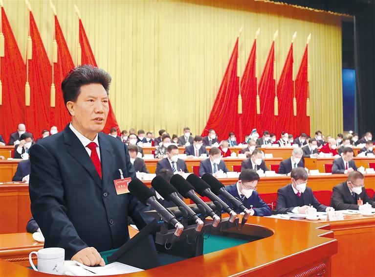 1月14日上午,自治區(qū)第十二屆人民代表大會第一次會議舉行第二次全體會議。洛桑江村向大會作自治區(qū)人大常委會工作報告。 記者 唐斌 攝