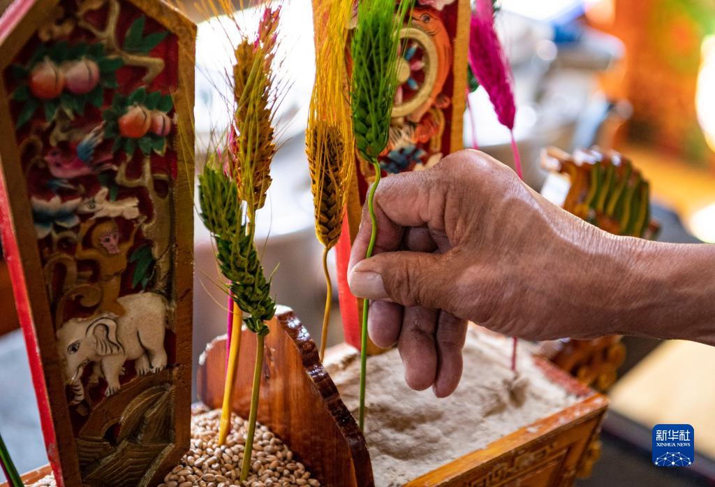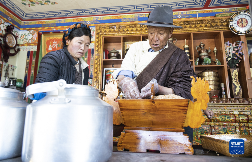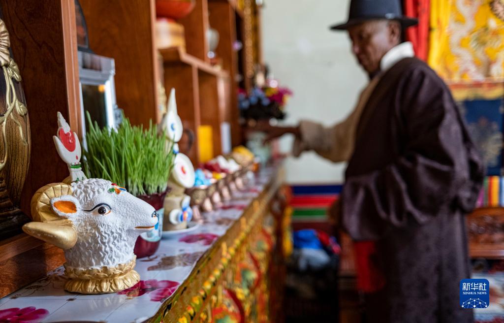 2月20日,在位于西藏拉薩市墨竹工卡縣門(mén)巴鄉(xiāng)的家中,扎西次仁用五彩青稞穗裝點(diǎn)象征吉祥的“切瑪”。新華社發(fā)(丁增尼達(dá) 攝)