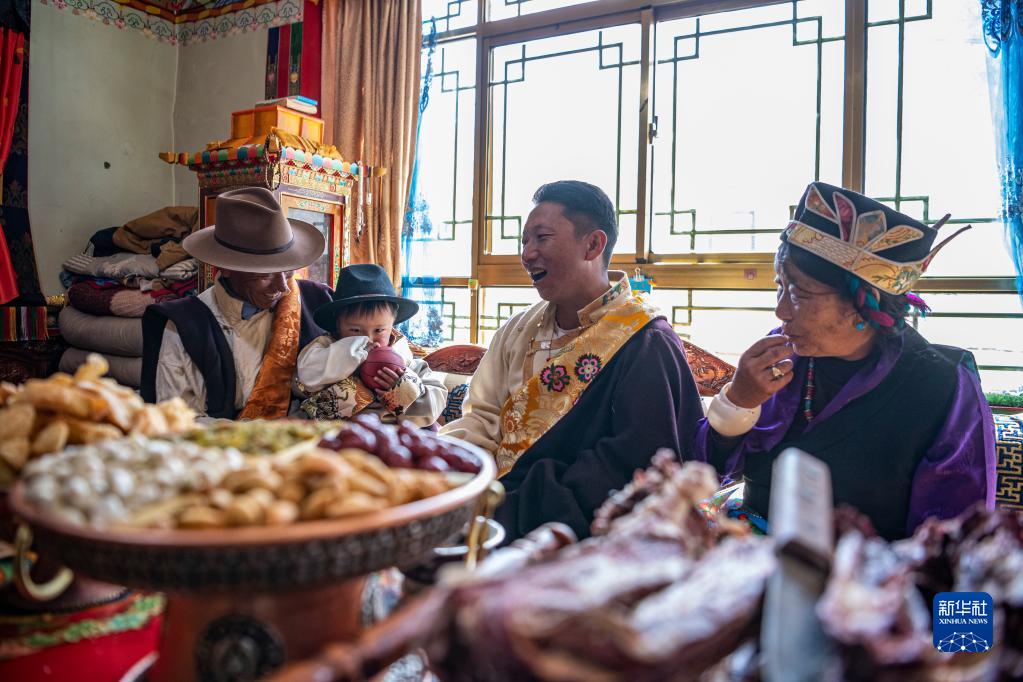 2月20日,在位于西藏拉薩市墨竹工卡縣門(mén)巴鄉(xiāng)的家中,扎西次仁(左一)一家在聊天、享用美食。新華社記者 孫非 攝