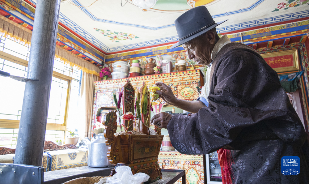 2月20日,在位于西藏拉薩市墨竹工卡縣門(mén)巴鄉(xiāng)的家中,扎西次仁用五彩青稞穗裝點(diǎn)象征吉祥的“切瑪”。新華社記者 孫非 攝