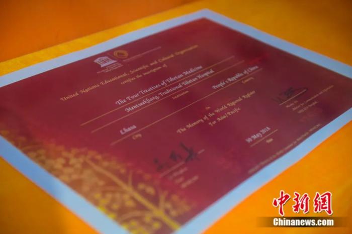 藏醫(yī)著作《四部醫(yī)典》入選《世界記憶亞太地區(qū)名錄》證書。貢嘎來(lái)松 攝