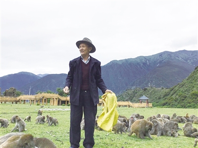 在多布杰看來,猴群也是一個(gè)小社會(huì),母子情深、朋友互助、爭(zhēng)斗打架都有。在上千只猴子中,多布杰只給一只臉特別紅的小猴子取了個(gè)名字——“瑪惹”,漢語(yǔ)意思是“小紅”。因?yàn)槌錾蠛飲寢寷]有奶水,它餓得嗷嗷直叫,多布杰只得將它帶回家中照料。那時(shí),他的孫女也特別喜歡這只小猴子,每天放學(xué)回家就會(huì)給它喂吃的。幾天后,孫女翻遍了每個(gè)角落都沒有找到“瑪惹”,急得嚎啕大哭。多布杰耐心地說,我們和“瑪惹”是好朋友,帶它回來是為了讓它活下去,但它終歸是要回到猴群中,回到猴媽媽身邊。“瑪惹”長(zhǎng)大后,也時(shí)常會(huì)找多布杰蹭衣撒嬌。