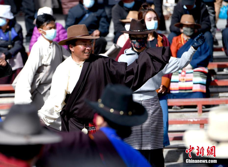 3月9日,西藏拉薩,民眾在宗角祿康公園表演朗瑪堆諧。李林 攝