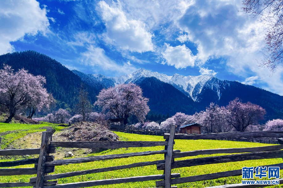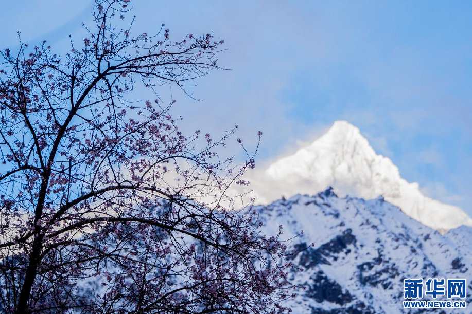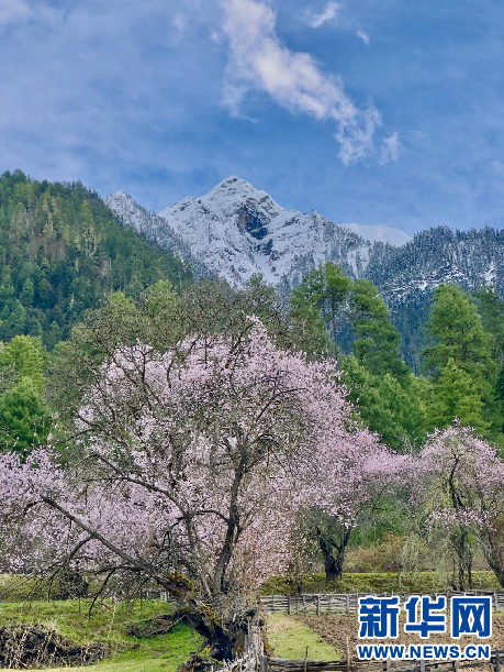 林芝市波密縣境內(nèi)桃花和雪山相互映襯(3月25日攝)。新華網(wǎng) 旦增努布 攝