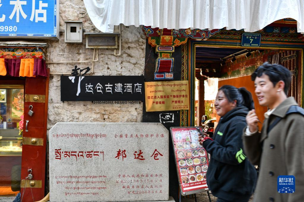 西藏拉薩市民走過八廓街老城區(qū)邦達(dá)倉古建酒店(2023年3月24日攝)。新華社記者 晉美多吉 攝